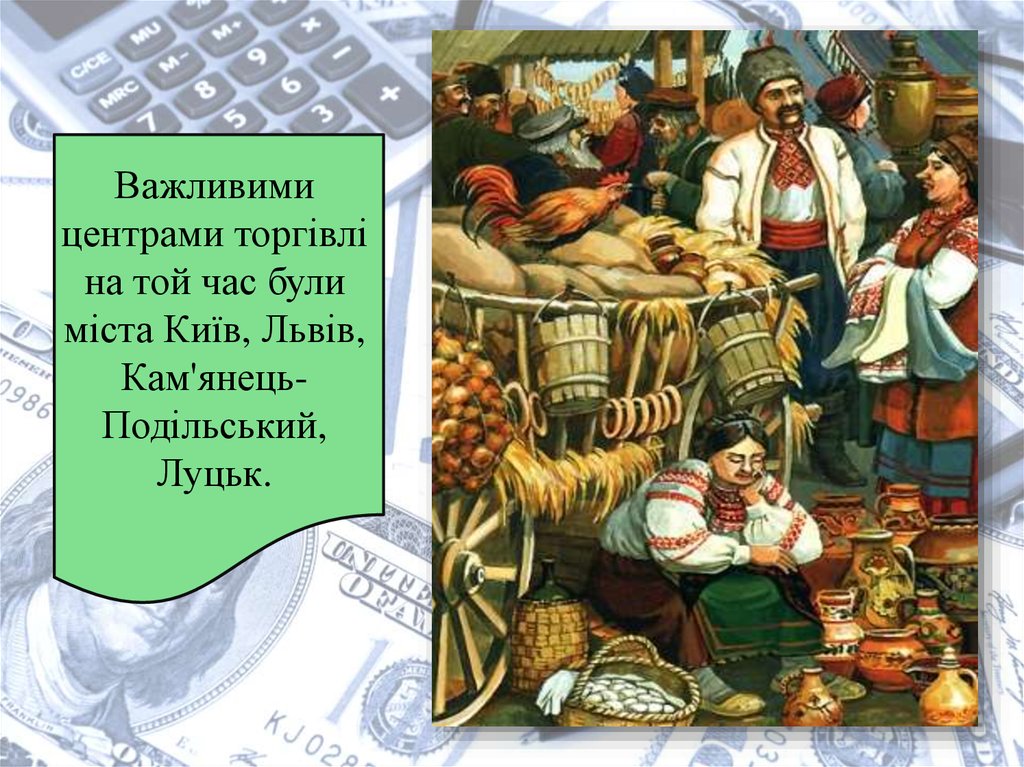 12. Важливими центрами торгівлі на той час були міста Київ, Львів, Кам'янець-Подільський, Луцьк.