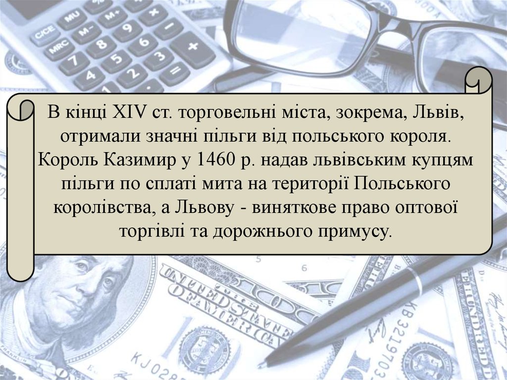 - в особи, яка вела облік.14. В кінці XIV ст. торговельні міста, зокрема, Львів, отримали значні пільги від польського короля. Король Казимир у 1460 р. надав