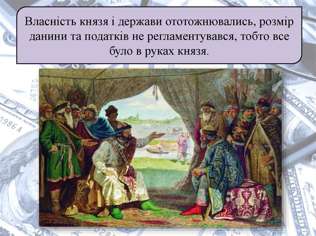 Власність князя і держави ототожнювались, розмірданини та податків не регламентувався, тобто все