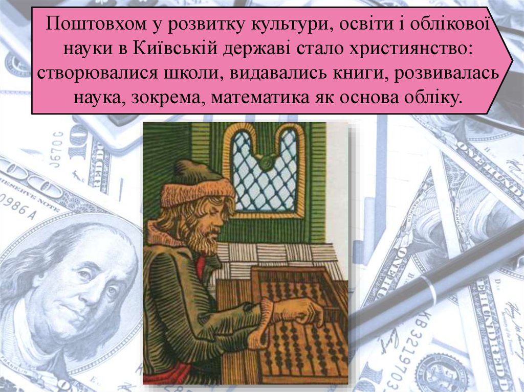 Поштовхом у розвитку культури, освіти і обліковоїнауки в Київській державі стало християнство: