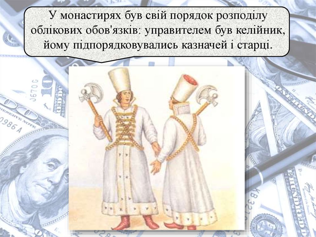 9. У монастирях був свій порядок розподілу облікових обов'язків: управителем був келійник, йому підпорядковувались казначей і