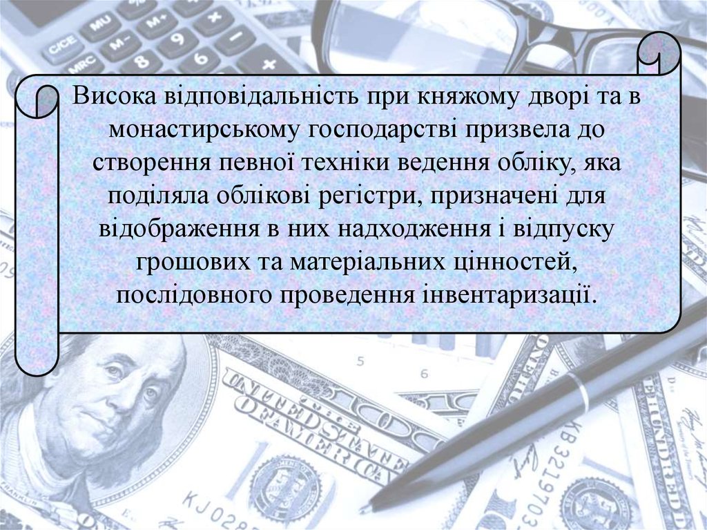 старці.10. Висока відповідальність при княжому дворі та в монастирському господарстві призвела до створення певної техніки ведення обліку,