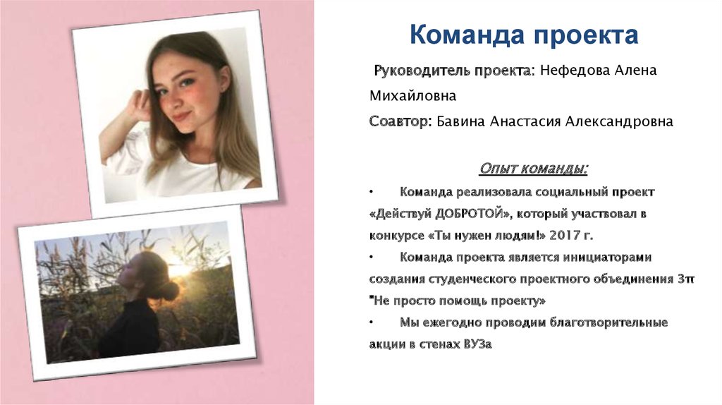 Команда проектаРуководитель проекта: Нефедова Алена