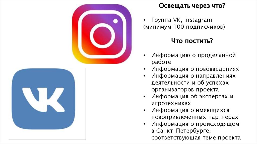 Освещать через что?• Группа VK, Instagram