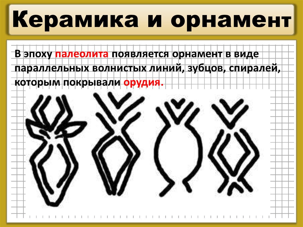 Керамика и орнаментВ эпоху палеолита появляется орнамент в виде