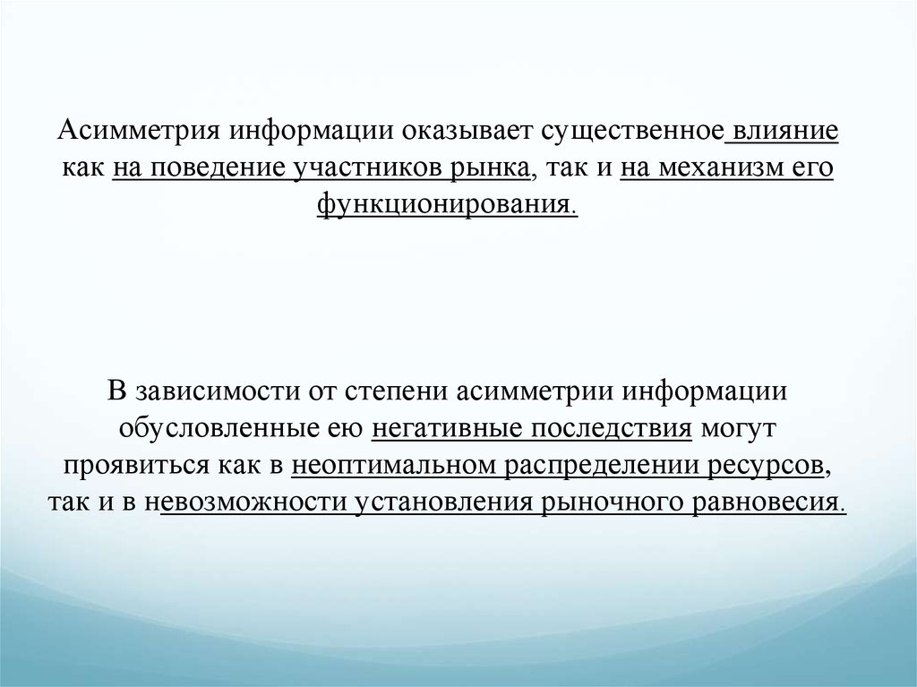 Асимметрия информации оказывает существенное влияниекак на поведение участников рынка, так и на механизм его
