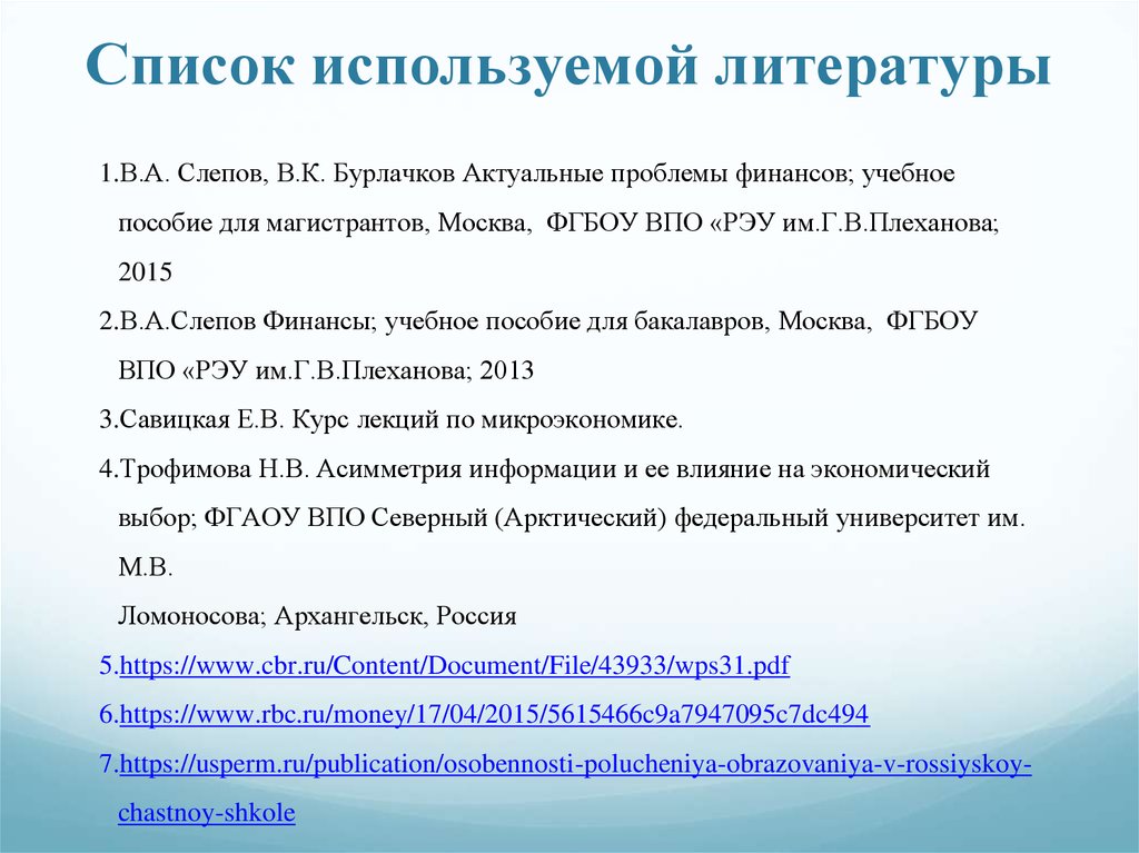 Список используемой литературы1.В.А. Слепов, В.К. Бурлачков Актуальные проблемы финансов; учебное
