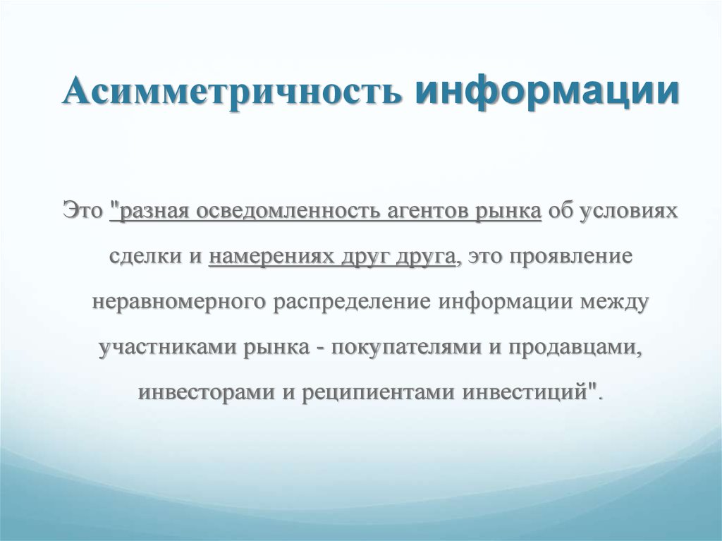 Асимметричность информацииЭто "разная осведомленность агентов рынка об условиях