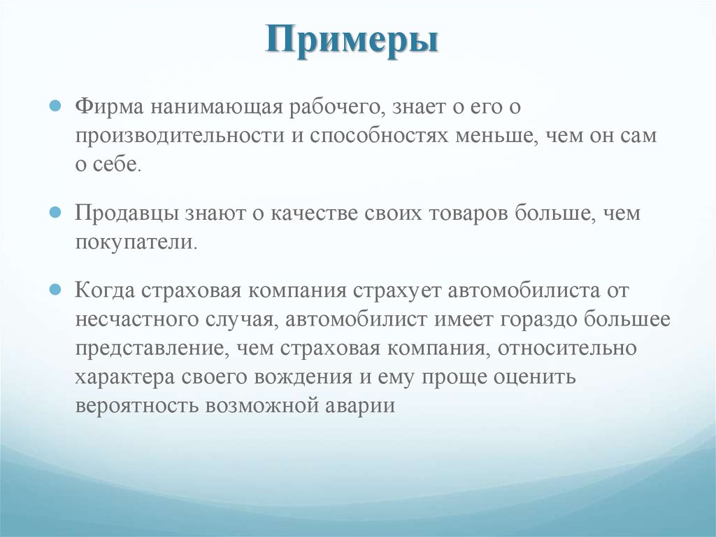 Примеры● Фирма нанимающая рабочего, знает о его о
