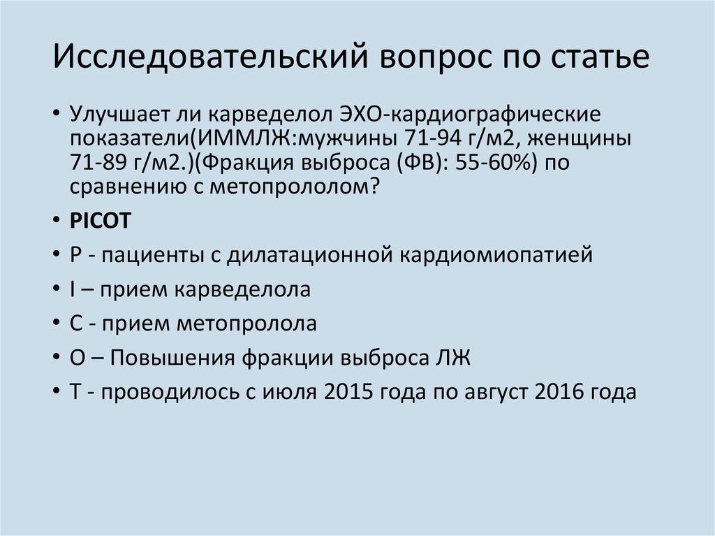 Исследовательский вопрос по статье• Улучшает ли карведелол ЭХО-кардиографические