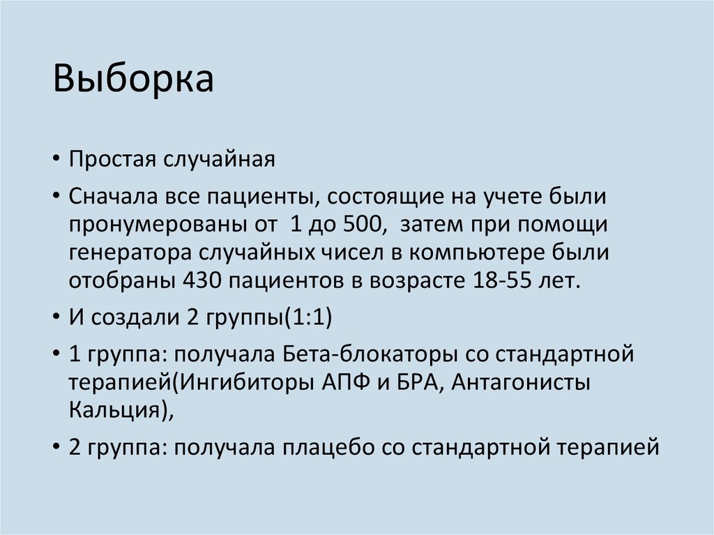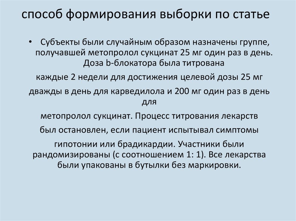 способ формирования выборки по статье• Субъекты были случайным образом назначены группе,