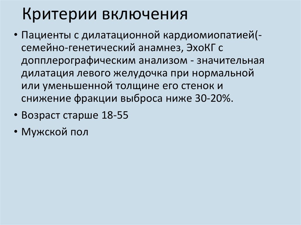 Критерии включения• Пациенты с дилатационной кардиомиопатией(семейно-генетический анамнез, ЭхоКГ с