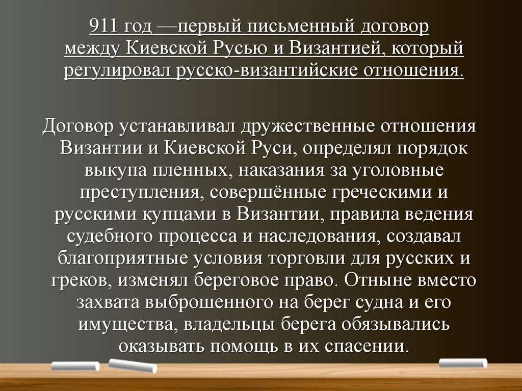 911 год —первый письменный договормежду Киевской Русью и Византией, который