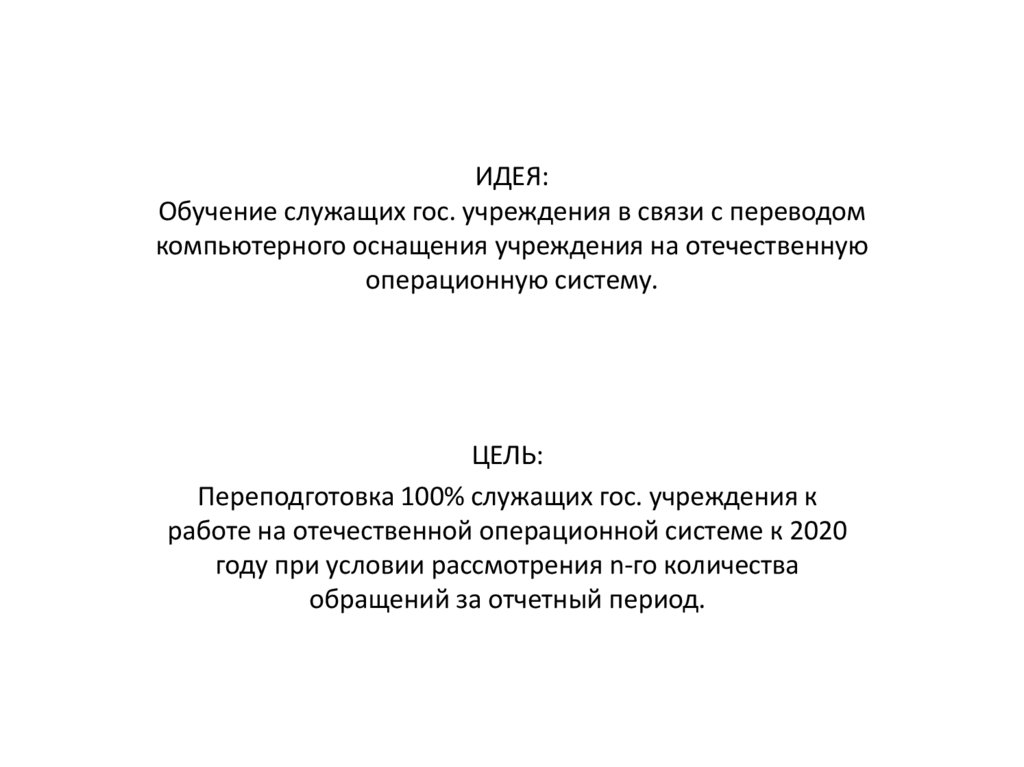 1. ИДЕЯ: Обучение служащих гос. учреждения в связи с переводом компьютерного оснащения учреждения на отечественную операционную