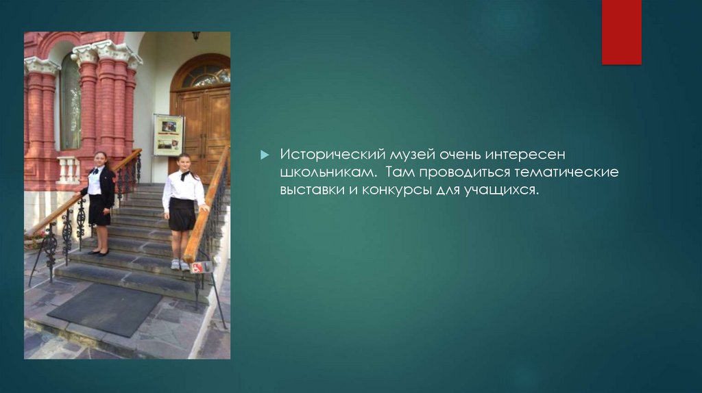 Исторический музей очень интересеншкольникам. Там проводиться тематические