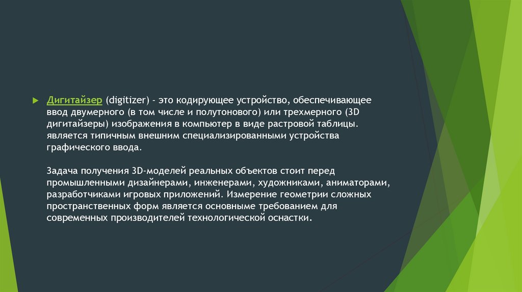 Дигитайзер (digitizer) - это кодирующее устройство, обеспечивающееввод двумерного (в том числе и полутонового) или трехмерного (3D