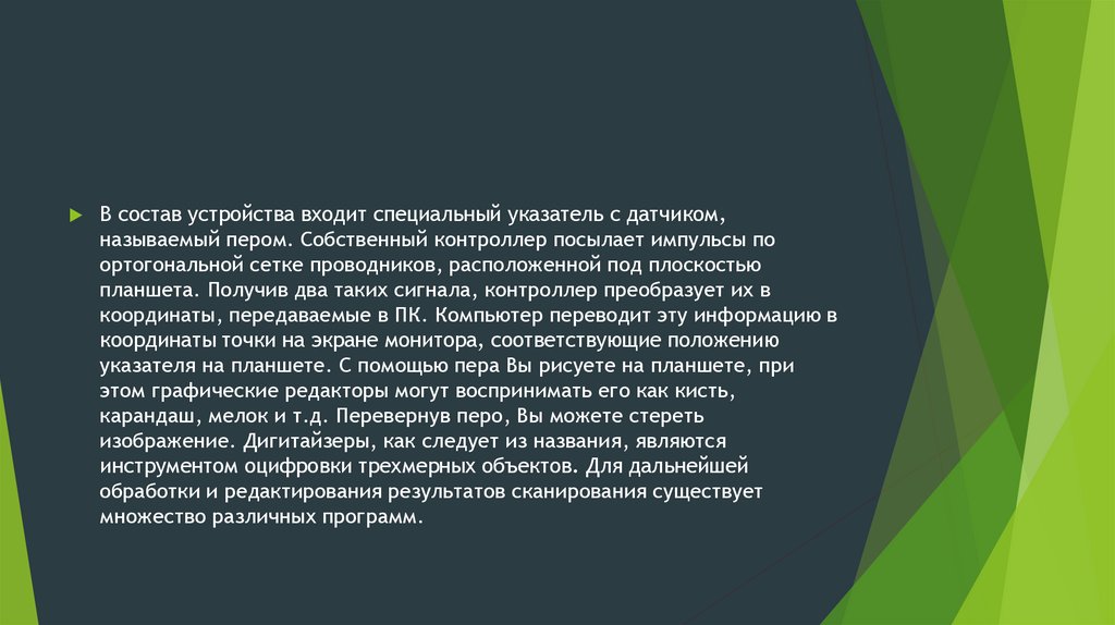 В состав устройства входит специальный указатель с датчиком,называемый пером. Собственный контроллер посылает импульсы по
