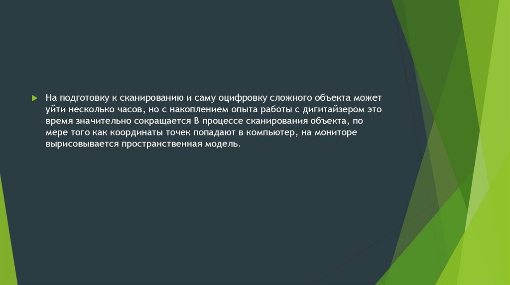На подготовку к сканированию и саму оцифровку сложного объекта можетуйти несколько часов, но с накоплением опыта работы с дигитайзером это