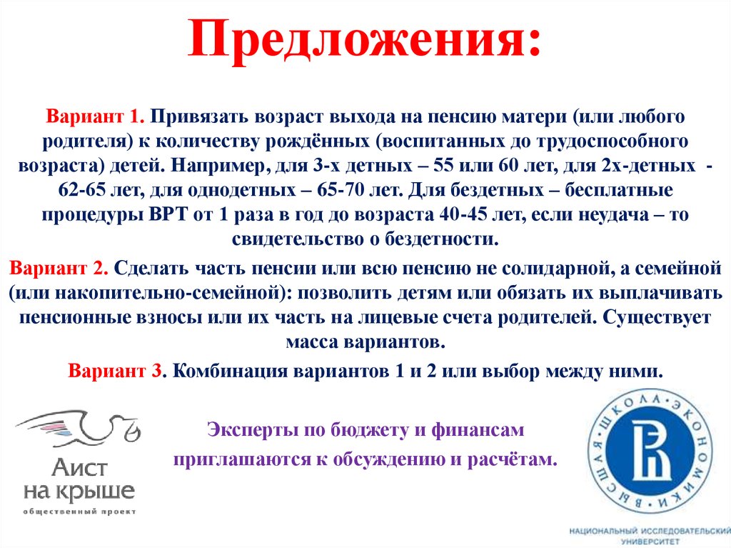 Предложения:Вариант 1. Привязать возраст выхода на пенсию матери (или любого