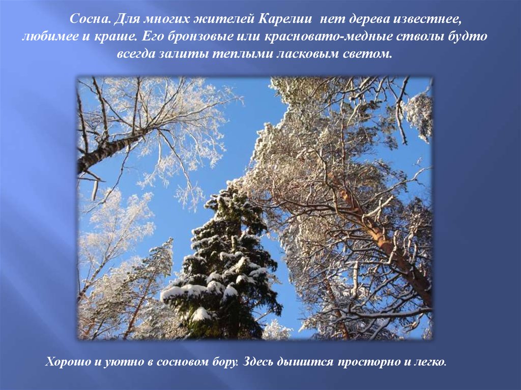 Сосна. Для многих жителей Карелии нет дерева известнее,любимее и краше. Его бронзовые или красновато-медные стволы будто