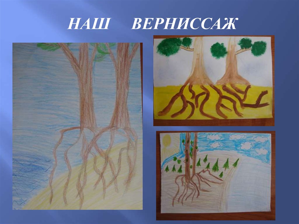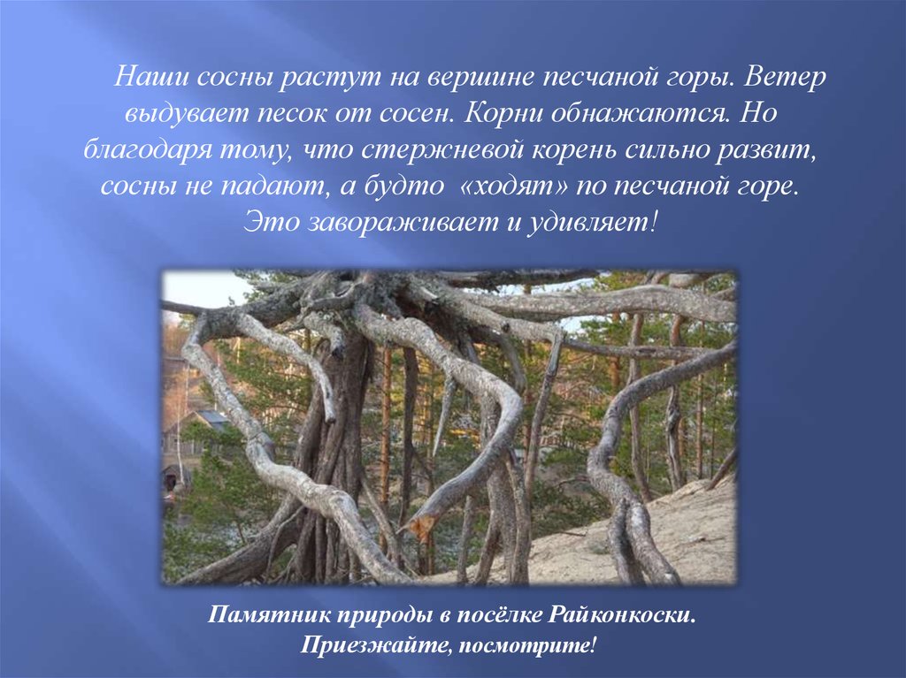 Наши сосны растут на вершине песчаной горы. Ветервыдувает песок от сосен. Корни обнажаются. Но