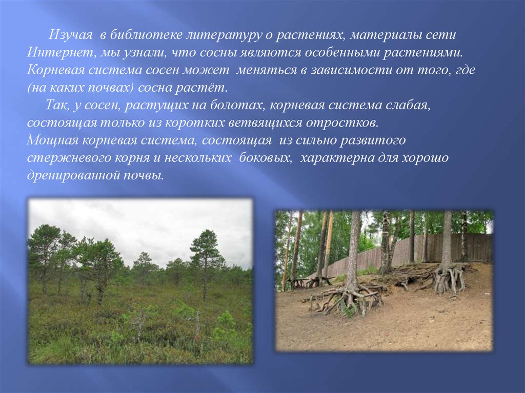 Так, у сосен, растущих на болотах, корневая система слабая,