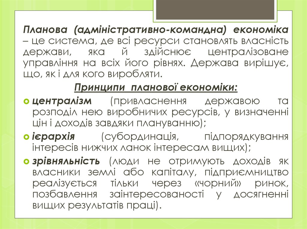Планова (адміністративно-командна) економіка– це система, де всі ресурси становлять власність