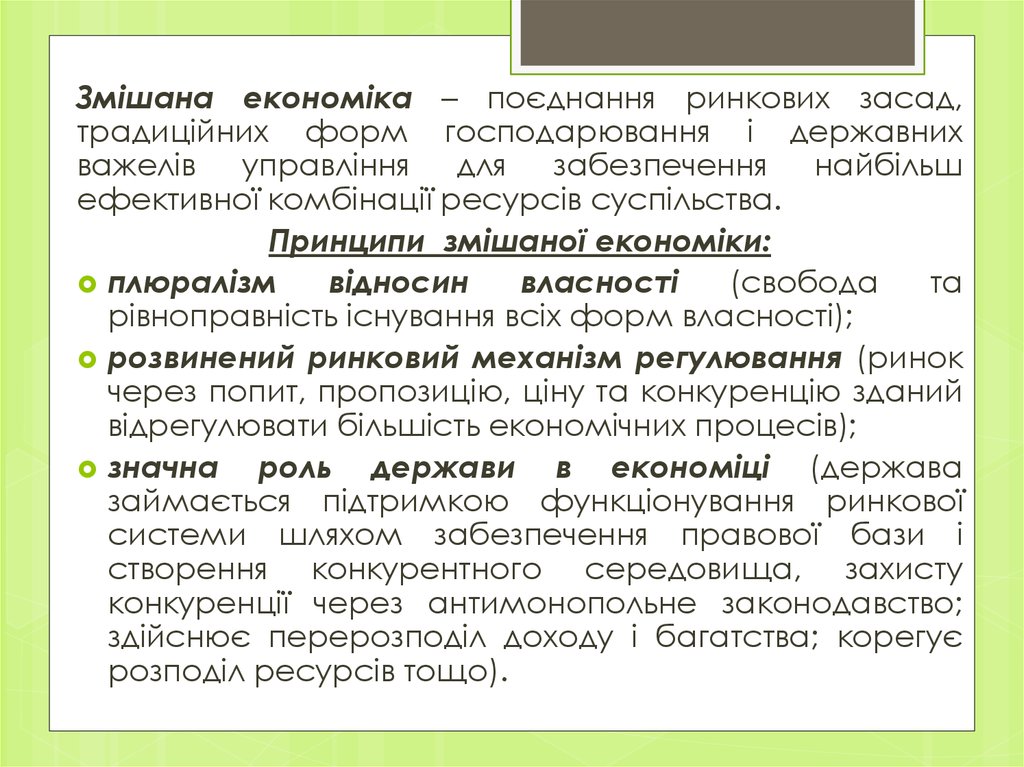 Змішана економіка – поєднання ринкових засад,традиційних форм господарювання і державних