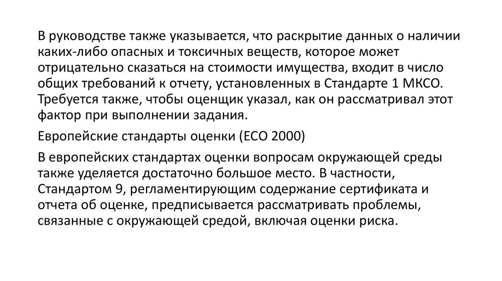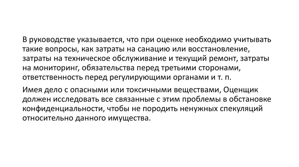В руководстве указывается, что при оценке необходимо учитыватьтакие вопросы, как затраты на санацию или восстановление,