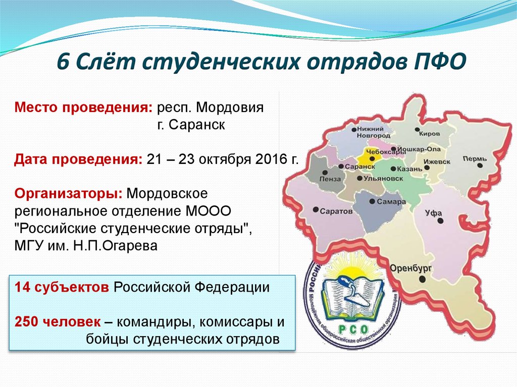 6 Слёт студенческих отрядов ПФОМесто проведения: респ. Мордовия