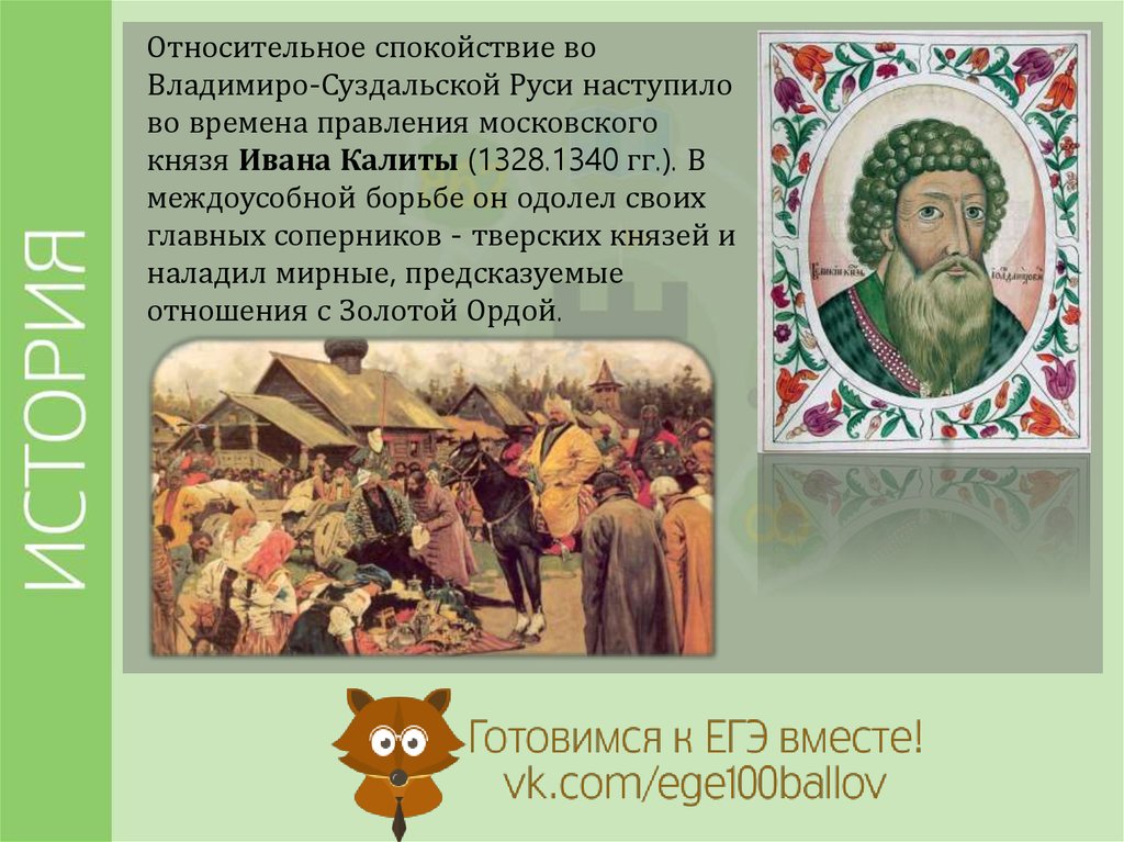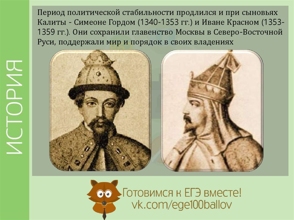 Период политической стабильности продлился и при сыновьяхКалиты - Симеоне Гордом (1340-1353 гг.) и Иване Красном (13531359 гг.). Они сохранили главенство Москвы в Северо-Восточной