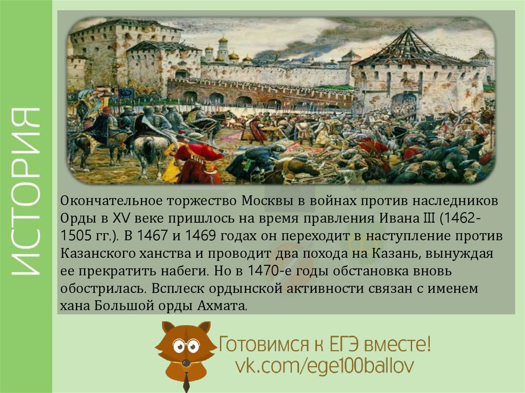 Окончательное торжество Москвы в войнах против наследниковОрды в XV веке пришлось на время правления Ивана III (14621505 гг.). В 1467 и 1469 годах он переходит в наступление против