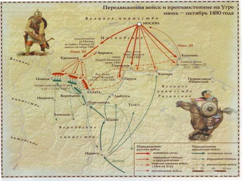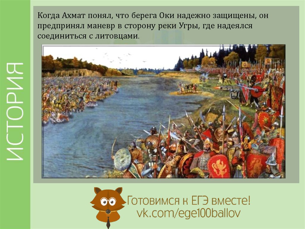 Когда Ахмат понял, что берега Оки надежно защищены, онпредпринял маневр в сторону реки Угры, где надеялся