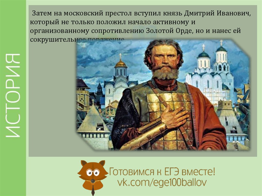Затем на московский престол вступил князь Дмитрий Иванович,который не только положил начало активному и