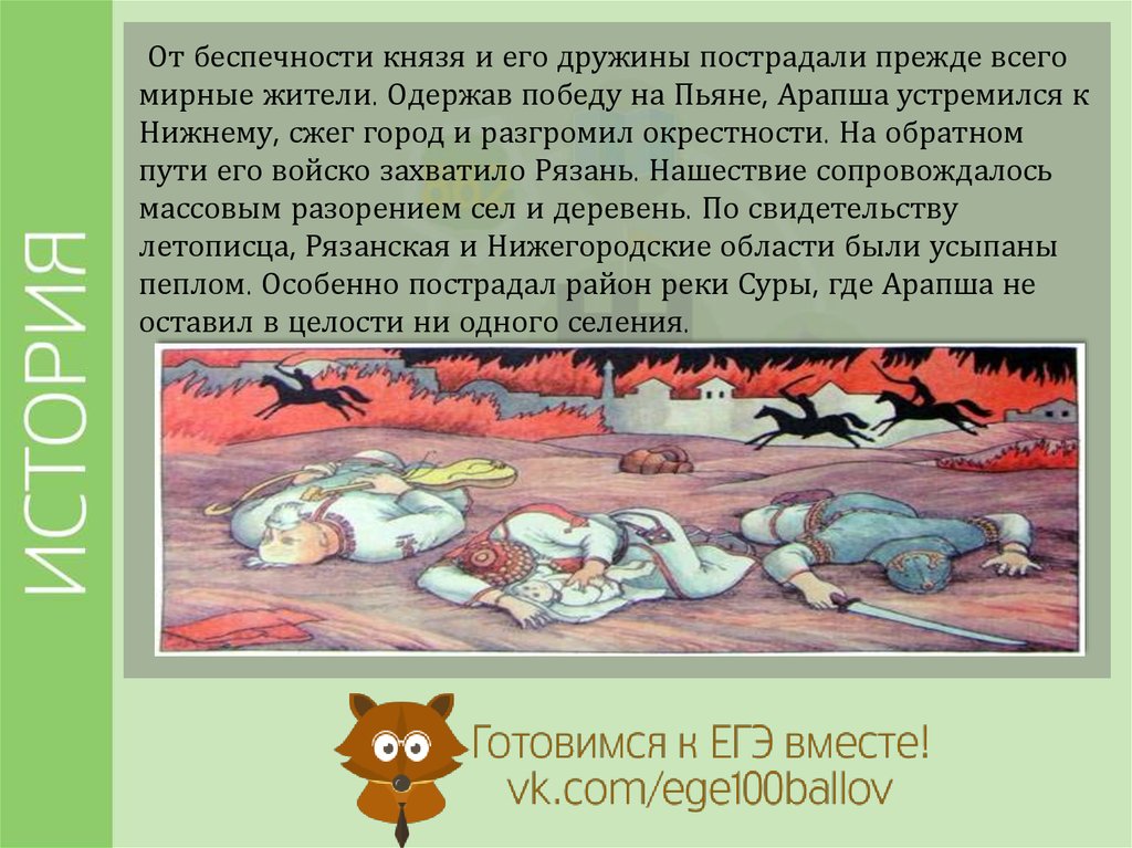 От беспечности князя и его дружины пострадали прежде всегомирные жители. Одержав победу на Пьяне, Арапша устремился к