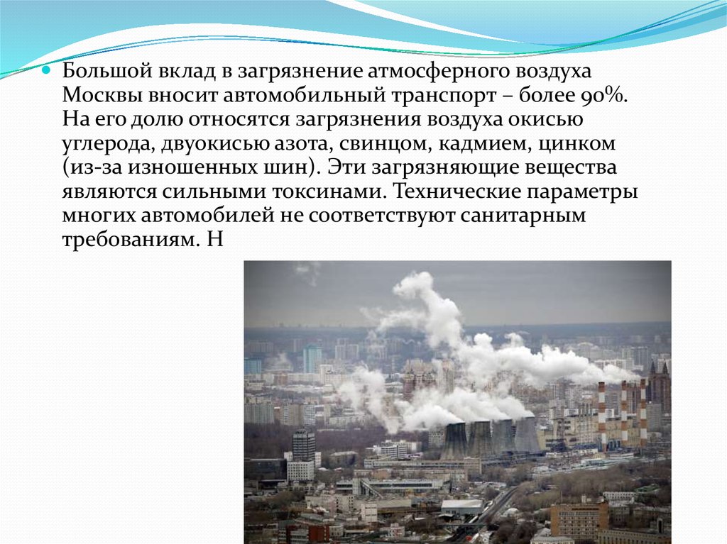 Большой вклад в загрязнение атмосферного воздухаМосквы вносит автомобильный транспорт – более 90%.