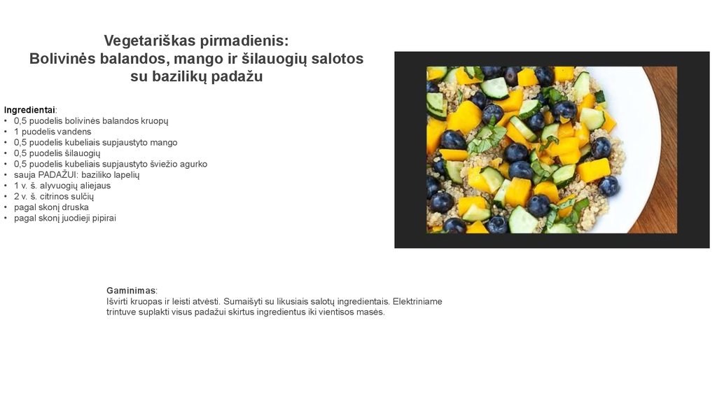 Vegetariškas pirmadienis:Bolivinės balandos, mango ir šilauogių salotos
