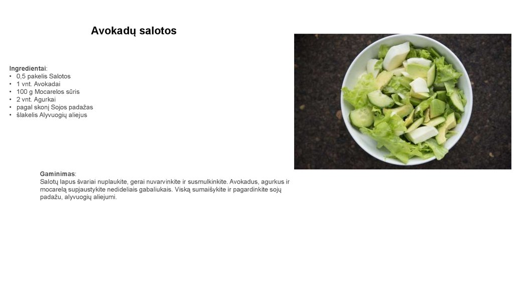 Salotų lapus švariai nuplaukite, gerai nuvarvinkite ir susmulkinkite. Avokadus, agurkus ir