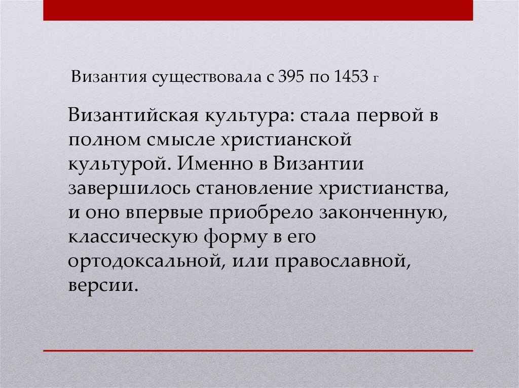Византия существовала с 395 по 1453 гВизантийская культура: стала первой в