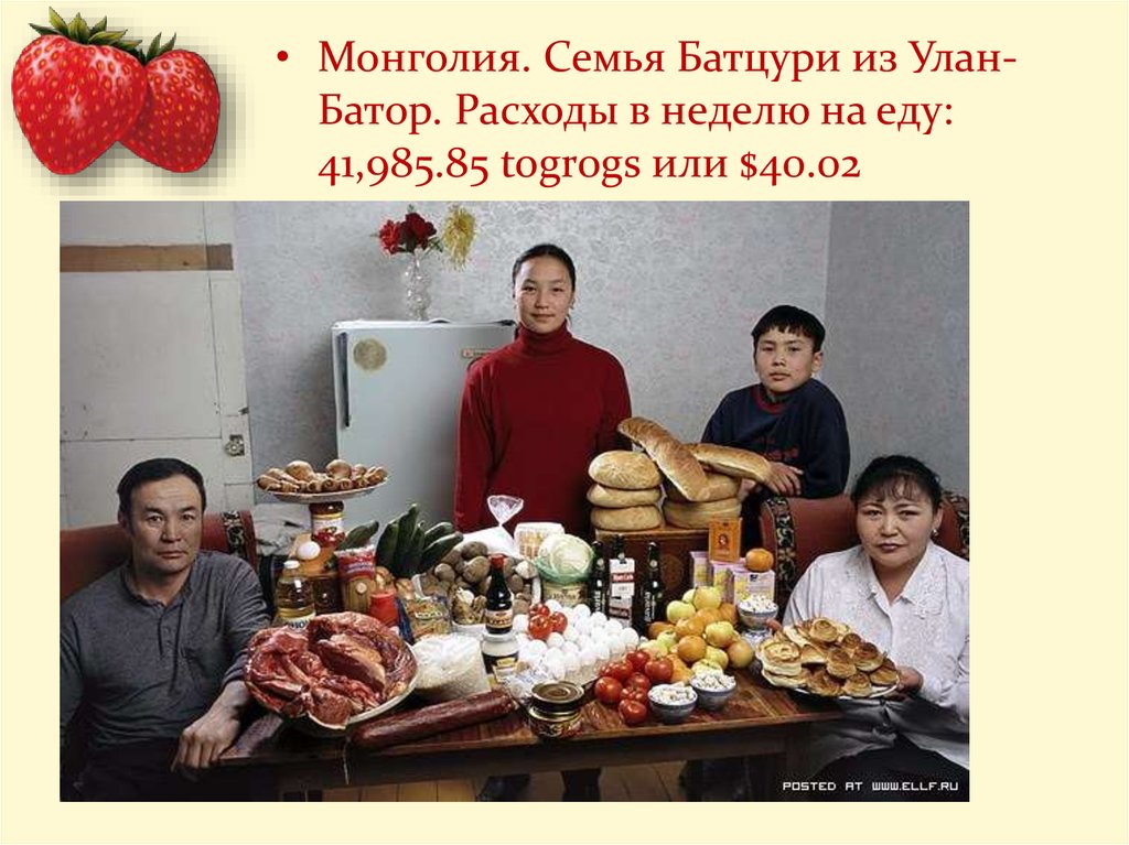 • Монголия. Семья Батцури из УланБатор. Расходы в неделю на еду:41,985.85 togrogs или $40.02