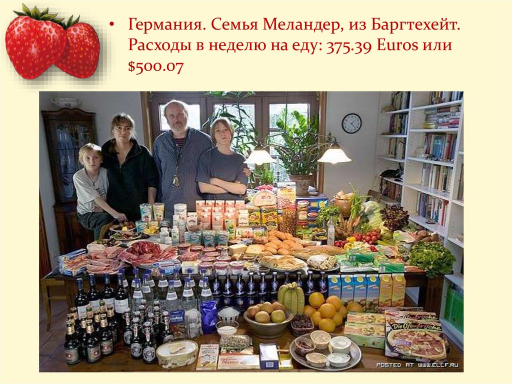 • Германия. Семья Меландер, из Баргтехейт.Расходы в неделю на еду: 375.39 Euros или
