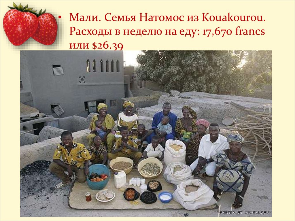 • Мали. Семья Натомос из Kouakourou.Расходы в неделю на еду: 17,670 francs