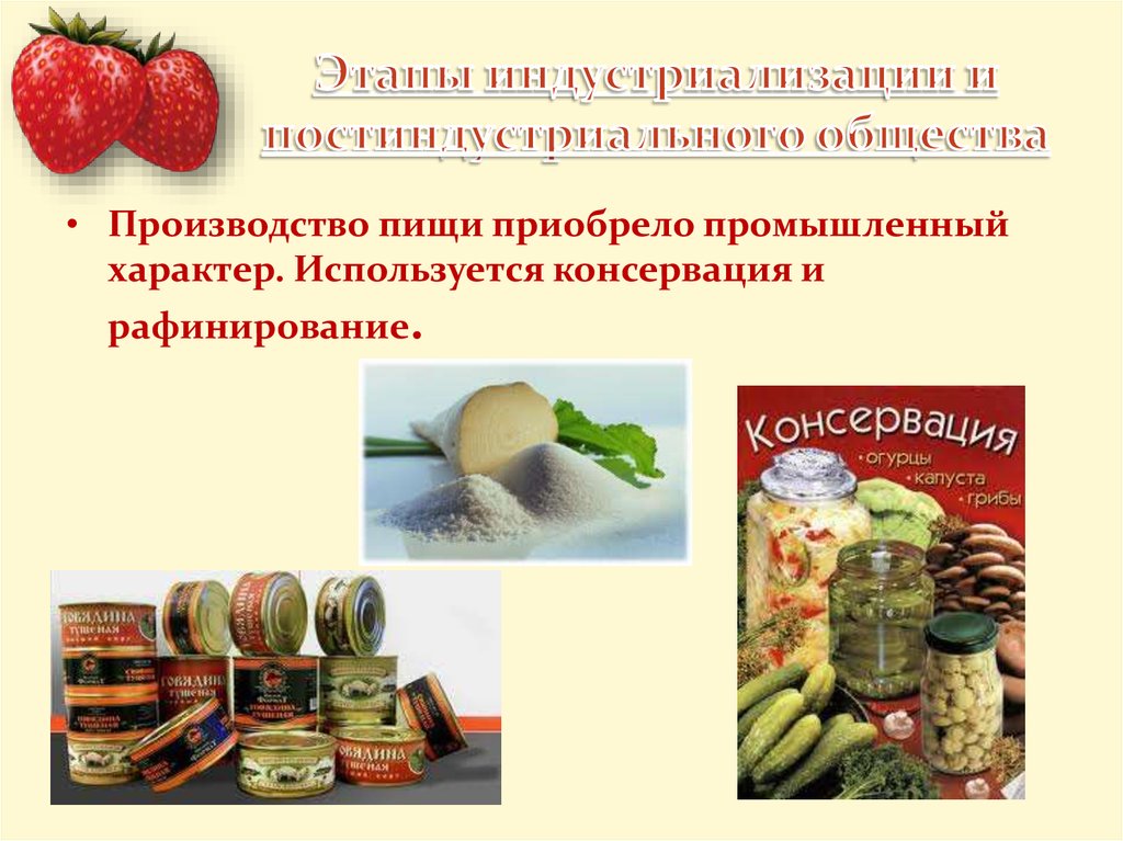 • Производство пищи приобрело промышленныйхарактер. Используется консервация и