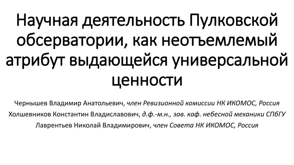 Чернышев Владимир Анатольевич, член Ревизионной комиссии НК ИКОМОС, РоссияХолшевников Константин Владиславович, д.ф.-м.н., зав. каф. небесной механики СПбГУ