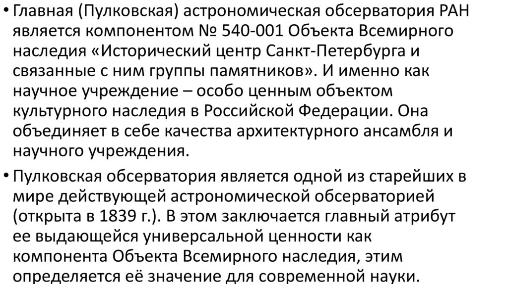 • Главная (Пулковская) астрономическая обсерватория РАНявляется компонентом № 540-001 Объекта Всемирного