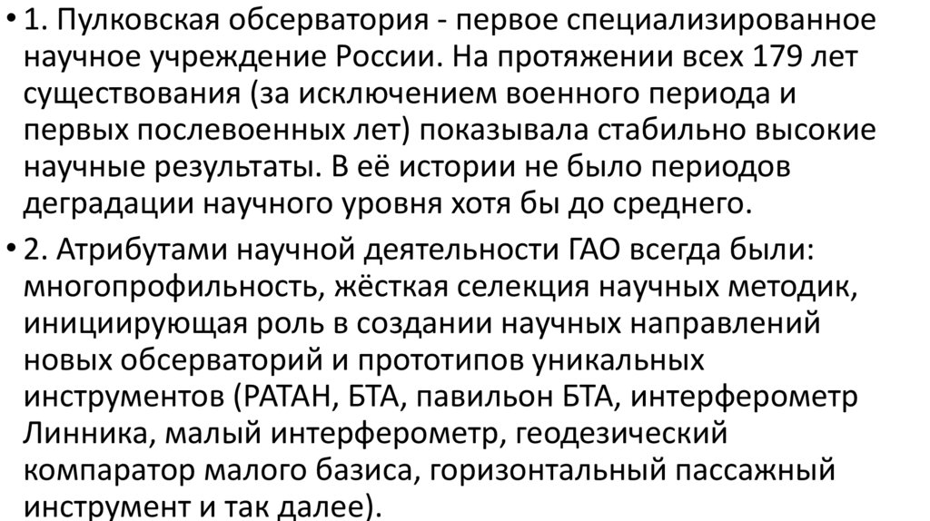 • 1. Пулковская обсерватория - первое специализированноенаучное учреждение России. На протяжении всех 179 лет