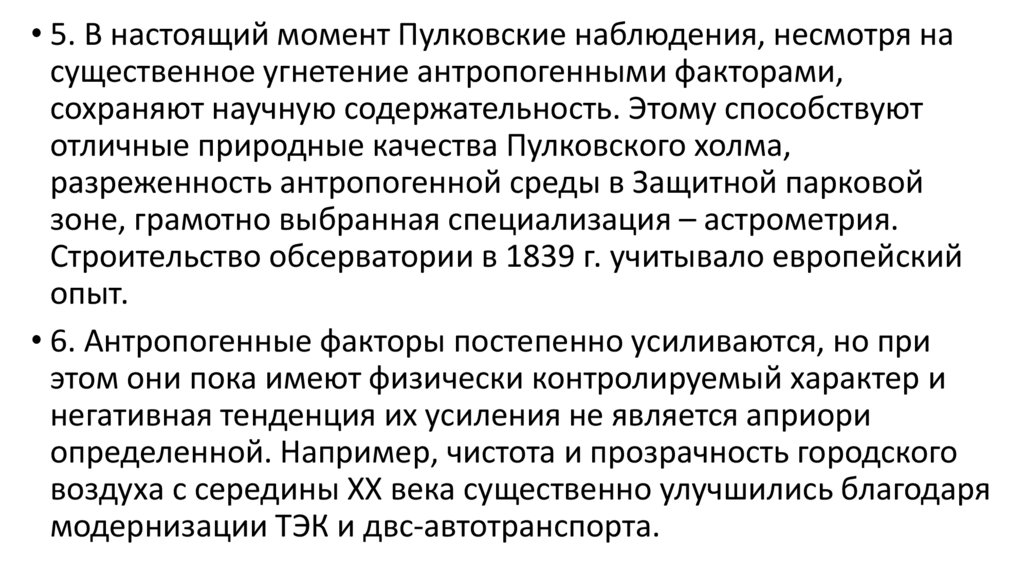 • 5. В настоящий момент Пулковские наблюдения, несмотря насущественное угнетение антропогенными факторами,