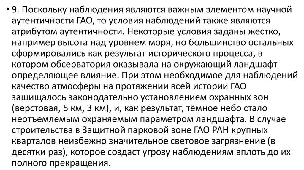 • 9. Поскольку наблюдения являются важным элементом научнойаутентичности ГАО, то условия наблюдений также являются