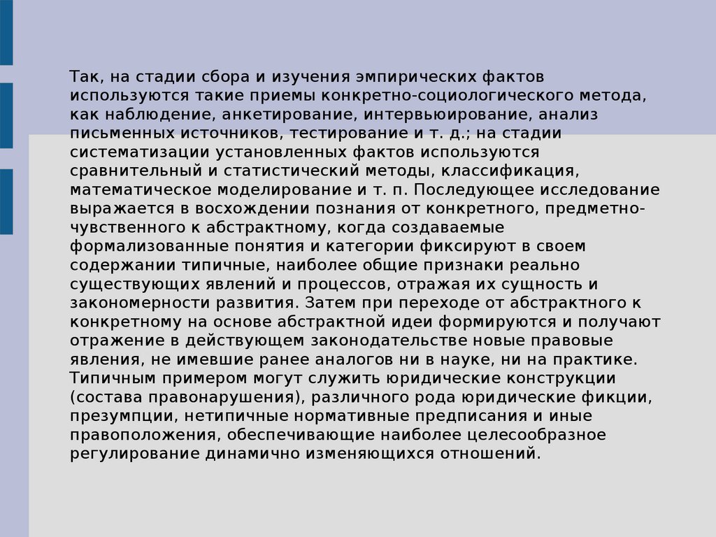 Так, на стадии сбора и изучения эмпирических фактовиспользуются такие приемы конкретно-социологического метода,