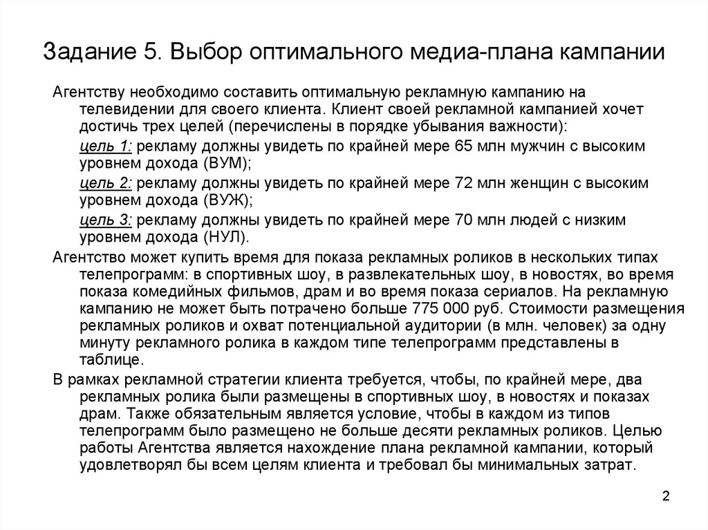 Задание 5. Выбор оптимального медиа-плана кампанииАгентству необходимо составить оптимальную рекламную кампанию на